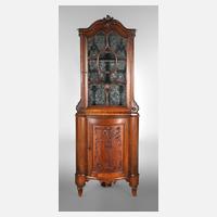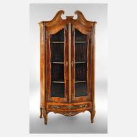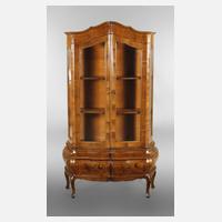 1. Hälfte 20. Jh., mit starkem Nussbaum sägefurniert, dreiseitig bombierter Korpus, Unterteil mit zwei Schubkästen, auf geschnitzten Klauenfüßen, facettierte Glasscheiben, Oberfläche mit Altersspuren, komplett mit Schlüssel, H 183 x B 114 x T 37 cm.