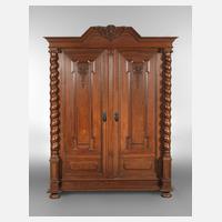 um 1900 im Barockstil, Eiche massiv, mittelbraun gebeizt, zerlegbarer zweitüriger Schrank mit Spiralsäulen und floral geschnitztem Gesims, Kassettenfüllungen, mit aufgesetzten, fein geschnitzten Mädchenköpfen, innen zwei Einlegeböden und Stangenschloss, mit Schlüssel, Fußleiste mit Bestoßungen und Fehlstellen, Bekrönung und Kapitell einer Säule bestoßen, rest. bed., Maße 215 x 163 x 71 cm.
