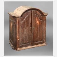 Mitte 18. Jh., Eiche massiv, dunkelbraun gefasst, zweitüriger Korpus mit abgeschrägten Ecken, allseitig facettiert, innen mit Regaleinteilung, restaurierungsbedürftig, H 113 x B 110 x T 60 cm.