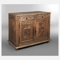 wohl Frankreich, Ende 18. Jh., Eiche massiv, überaus reich beschnitzter zweitüriger Korpus, mit langen Bändern und Zierbeschlägen aus Eisen, seitlich facettiert, die Platte abgeschliffen, sonst guter Originalzustand, mit Schlüssel, Maße 108 x 132 x 65 cm.