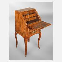 2. Hälfte 18. Jh., Nussbaummaser auf Nadelholz furniert, außergewöhnlich kleine Schreibkommode, mit Schrägklappe und zwei Schüben, furnierte Inneneinrichtung mit fünf Schüben, original Schlösser, Beschläge ergänzt, H 99 x B 44 x T 43 cm.