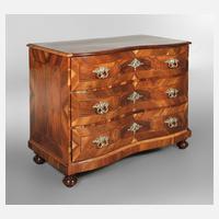 Mitte 18. Jh., Nussbaum auf Nadelholz furniert, dreischübiger Korpus, zweifach gebaucht, allseitig eingelegte Bänder aus Zwetschge und Ahorn, die Füllungen in Nussbaummaser, wohnfertig restauriert , Beschläge ergänzt, Maße 85 x 110 x 56 cm.
