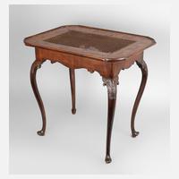 Rüster und Nussbaumwurzel auf Eiche furniert, Zarge und Beine aus Massivholz, rechteckige Platte mit abgerundeten Ecken und umlaufender Profilleiste, mittig mit originalem Geflecht, kleine Furnierfehlstelle sowie Alters- und Gebrauchsspuren, rest.bed., H 75 x B 79 x T 58 cm.
