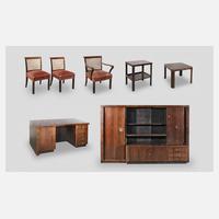 deutsch, 1930er Jahre, Palisander furniert, bestehend aus Bücherschrank, Schreibtisch, Tisch, Beistelltisch, Armlehnsessel und zwei Stühlen, asymmetrischer Schreibtisch frei im Raum stellbar, rs. mit Bücherregal (Schiebetür aus Glas fehlt), Bücherschrank mit Schiebetür komplett zerlegbar, Alters- und Gebrauchsspuren, rest.bed., Maße Schrank 251 x 166 x 58 cm, Maße Schreibtisch 170 x 89 x 76 cm.
