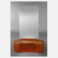 um 1930, Kirschbaum furniert, nierenförmiges Unterteil mit zwei Schubkästen und zwei Türen, Handhabe und Schlüssel fehlen, rest.bed., H 170 x B 125 x T 45 cm.