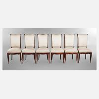 Frankreich, 1930er Jahre, elegante Speisezimmerstühle aus massiver Buche, braun gebeizt, Sitzfläche mit hohem Federkernpolster, Bezüge erneuert, wohnfertig restauriert, ein Stuhl mit kleiner fixierter Bruchstelle an der Lehne, H 98 cm, SH 47 cm.
