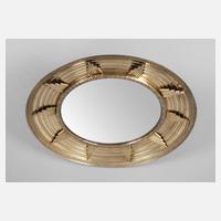 um 1925, Messingblech geprägt, ruder Wandspiegel mit Strahlenmotiv aus verlöteten Messingstäben, D 46 cm.