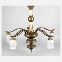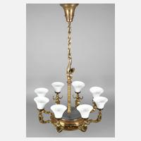 um 1920, ungemarkt, Messing getrieben und massiv, mehrteilig gegossen und verschraubt, an schwerer Gliederkette gehängter Korpus mit acht figürlich gearbeiteten Leuchterarmen in Form leicht stilisierter Nereiden, mit erhobenen Armen, jeweils eine Lampenfassung tragend, mit eingesteckten glockenförmigen Schirmen aus Milchglas, sehr gute Erhaltung, H 120 cm, D 80 cm.
