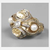um 1920, unleserlich gestempelt, 14 Karat Gelbgold geprüft, feine Granulatarbeit, teilweise aus Weißgold, besetzt mit einem leicht gelblichen Brillant, ca. 0,2 ct, vielen kleinen Diamantrosen und zwei Zuchtperlen D 5 mm, RW 20 mm, G ca. 10,3 g.