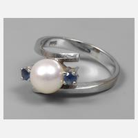 2. Hälfte 20. Jh., Weißgold gestempelt 585, gegenläufige Ringschiene besetzt mit zwei kleinen Saphiren und einer Zuchtperle, D 7 mm, RW 17 mm, G ca. 4 g.