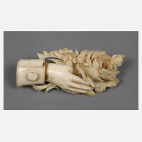 Mitte 19. Jh., fein geschnitzte Hand, einen Blumenstrauß haltend, Metallnadel mit Messingöse, Knopf nicht ganz komplett, L 5,5 cm.