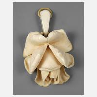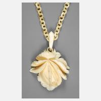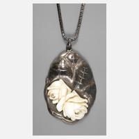 um 1900, Silber gestempelt 900, Herstellermarke AM, hohl verbödet, besetzt mit zwei geschnitzten Elfenbeinrosen, an langem Silberkettchen gestempelt 925, L Anhänger 7 cm, Kette 68 cm, G ca. 33,2 g.