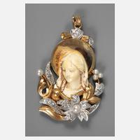 wohl Italien, Mitte 20. Jh., 18 Karat Gelbgold geprüft, partiell platiniert, besetzt mit kleinen Brillanten und Diamanten in blütenartigen Fassungen, fünf kleine Zuchtperlen, mittig Heiligendarstellung Maria, aus Elfenbein fein geschnitzt, an der Stirn ein Trocknungsriss, L 5,5 cm, G ca. 16,9 g.