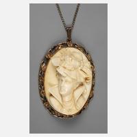 1950er Jahre, Gelbgold gestempelt 585, Herstellermarke HM, florale, durchbrochen gearbeitete Fassung mit geschnitztem Mädchen mit Hut, zweiteilig montiert, Kette vergoldet, L Anhänger 7,5 cm, gute Erhaltung, G total ca. 41,9 g.