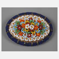 um 1930, auf einer Kunststoffplatte gefädelte Blütenmotive auf mehreren Ebenen, gute Erhaltung, L 5,5 cm.