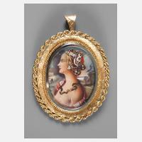 2. Hälfte 20. Jh., Gelbgold gestempelt 750, Herstellermonogramm CM?, die Fassung fein graviert, unter Glas eine Gouache auf Bein mit Diamantbesatz, Mädchenportrait in Landschaft, als Anhänger oder Brosche zu tragen, L 5 cm, G ca. 14,4 g.