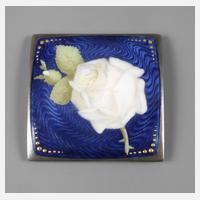 um 1920, Silber gestempelt 900, rückseitig vergoldet, transluzid emailliert auf Gouillochégrund, Darstellung einer Rosenblüte mit Knospe, in den Ecken Goldtupfen, drei Stege und ein Gegenstück, D 7,5 cm, G ca. 59,2 g.