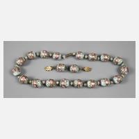 1930er Jahre, hellblaue Glasperlen, bunt emailliert mit Kupferaventurinaufschmelzungen, Kette mit zwei passenden Ohrclips, L 4 und 40 cm.