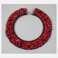 um 1930, feine Fädelarbeit aus verschieden geschliffenen Korallen und Glassteinen mit Hämatit und Onyx?, Verschluss aus Nickelsilber, D 13 cm.