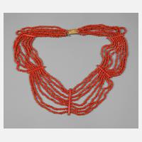 um 1900, Verschluss Gelbgold gestempelt 585, Korallen in feiner Lupenschnitzerei aus unzähligen Teilen gefädelt, fünf Zwischenstege mit abgehängten Festons, etwas reparaturbedürftig, L 36 cm.