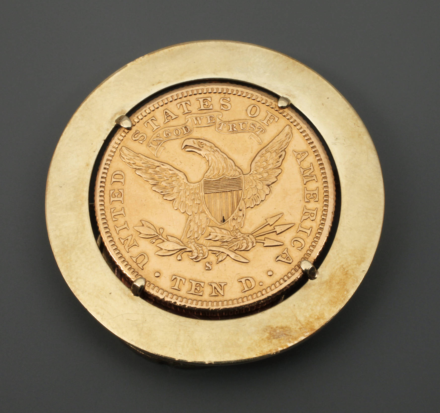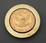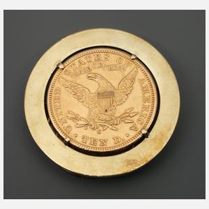10 Dollar, f.vz, in vergoldeter Fassung, diese rückseitig mit Öse und Anstecknadel.