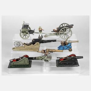 um 1915, gemarkt, Blech farbig lackiert, für Zündplättchen- und/oder Gummigranatenfeuerung, teils höhenverstellbar, bestehend aus Festungsgeschütz mit zwei kleinen Laufrollen und Flugabwehrgeschütz, beide mit Messingrohr und Keilverschluss, Feldgeschütz (Modell 8039) sowie Protze mit offener Rückenlehne und einigen Gummigranaten im Munitionskasten, dazu zwei Kanonen Hess, ein ungedeutetes Stück und Elastolin Massesoldat, untersch. Alters- und Gebrauchsspuren, teils fragmentarisch, L 11 bis 23 cm.
