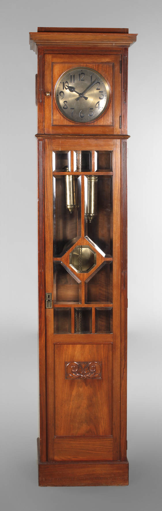 um 1910, auf dem Werk gemarkt, Gehäuse aus massivem Nussbaum mit facettierten Glasscheiben, zwei Gewichte, Halbstundenschlag auf Tonfeder, guter Originalzustand, funktionstüchtig, H 218 x B 51 x T 36 cm.