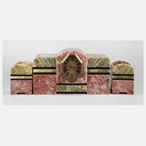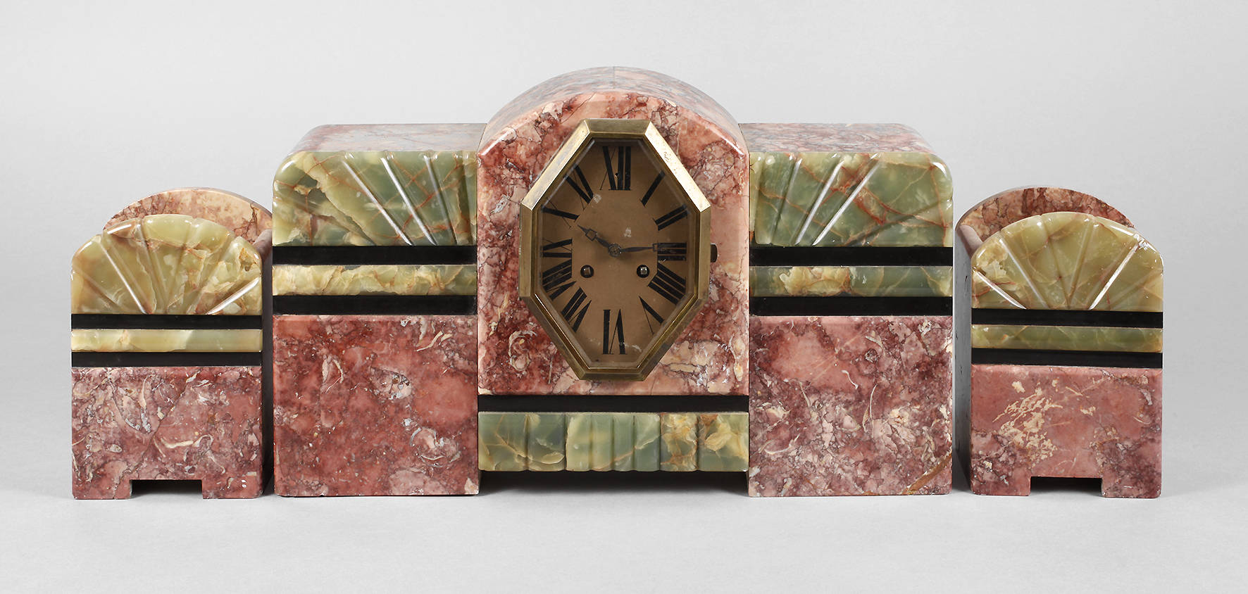Frankreich, 1930er Jahre, Gehäuse aus rötlich geädertem Marmor, schwarzem und grünem Onyx mit geschliffenem geometrischen Dekor, zwei passende Beisteller, Pendulenwerk mit Halbstundenschlag auf Glocke, funktionstüchtig mit Schlüssel, H 27 x B 46 x T 14 cm.