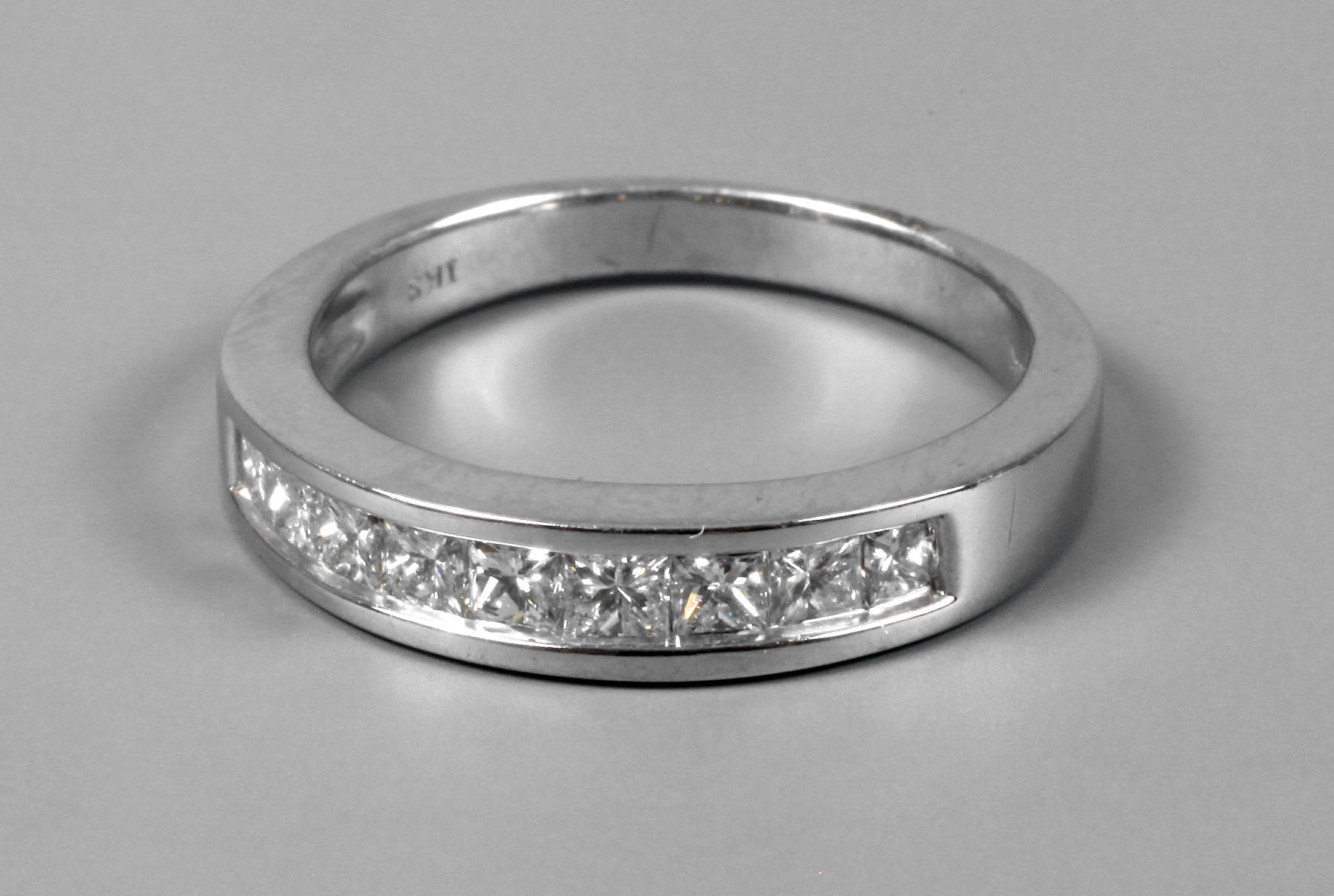 2. Hälfte 20. Jh., Weißgold gestempelt 14 Karat , Herstellermarke IKS, besetzt mit neun Diamanten in Carreeschliff, RW 17 mm, G ca. 4 g.
