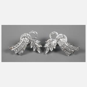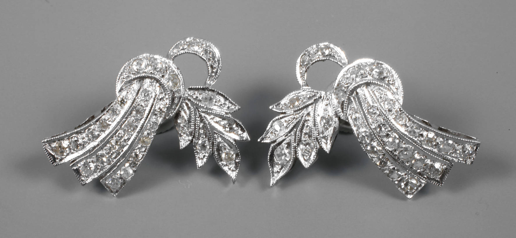 2. Hälfte 20. Jh., 750er Weißgold geprüft, als Blütenzweig mit Schleife, besetzt jeweils mit 28 kleinen Diamanten, L 3 cm, G ca. 7,7 g.
