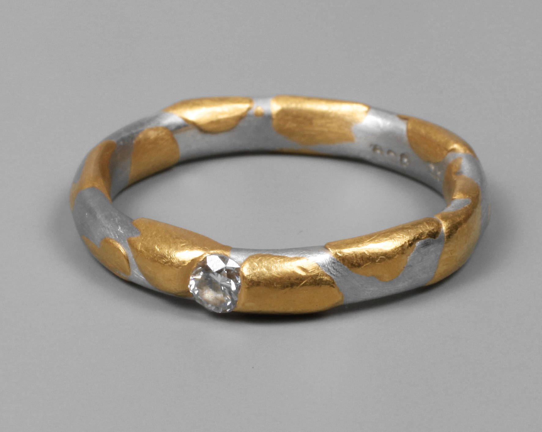 2. Hälfte 20. Jh., unleserlich gestempelt 900?, besetzt mit einem Brillant, ca. 0,10 ct, RW 19 mm, G ca. 8 g.