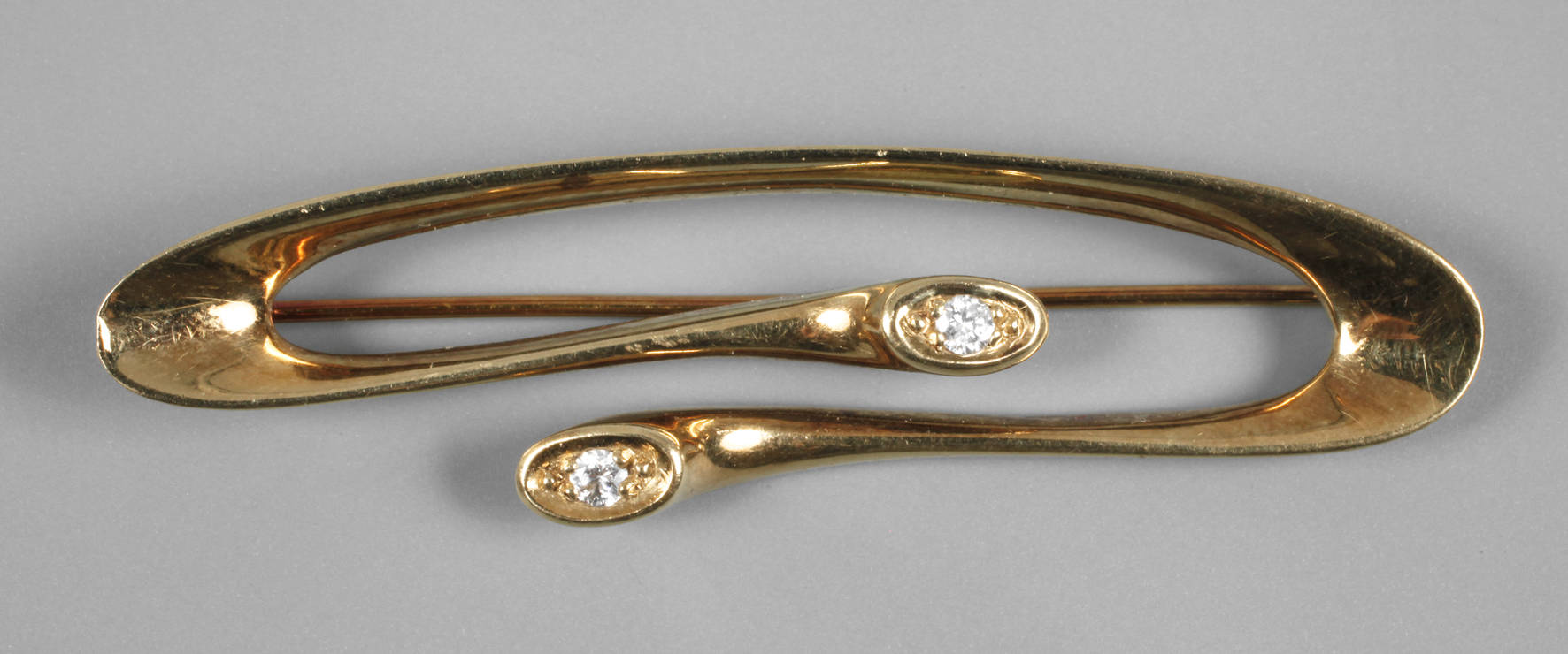 2. Hälfte 20. Jh., Gelbgold gestempelt 585, Herstellermonogramm A im Kreis, besetzt mit zwei kleinen Brillanten, je ca. 0,05 ct, L 5,5 cm, G ca. 7,9 g.