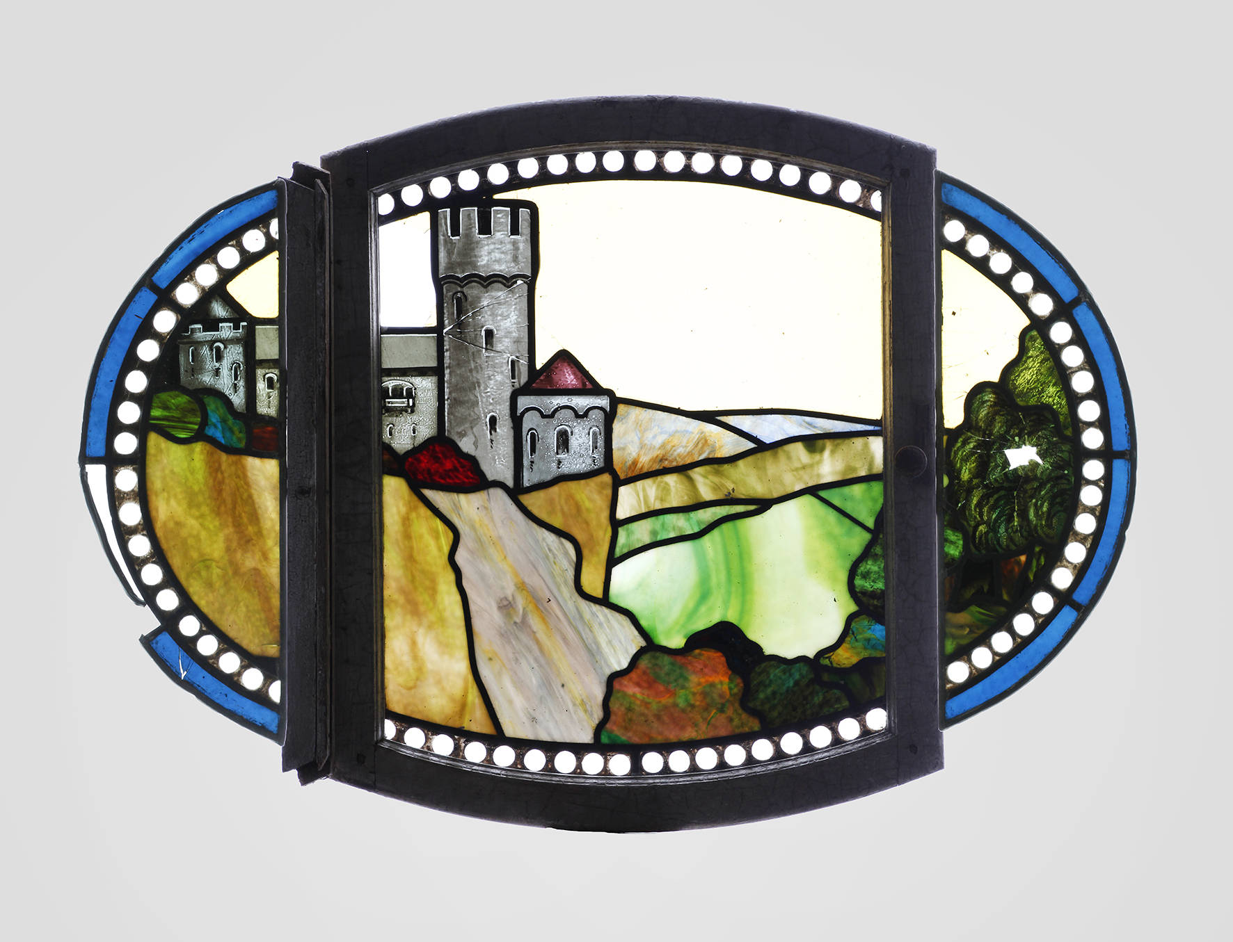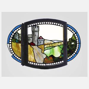 um 1900, dreiteiliges ovales Fenster, teils gemaltes Motiv Burg in Landschaft, beschädigt, rest.bed., IM 53 x 90 cm.