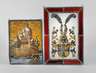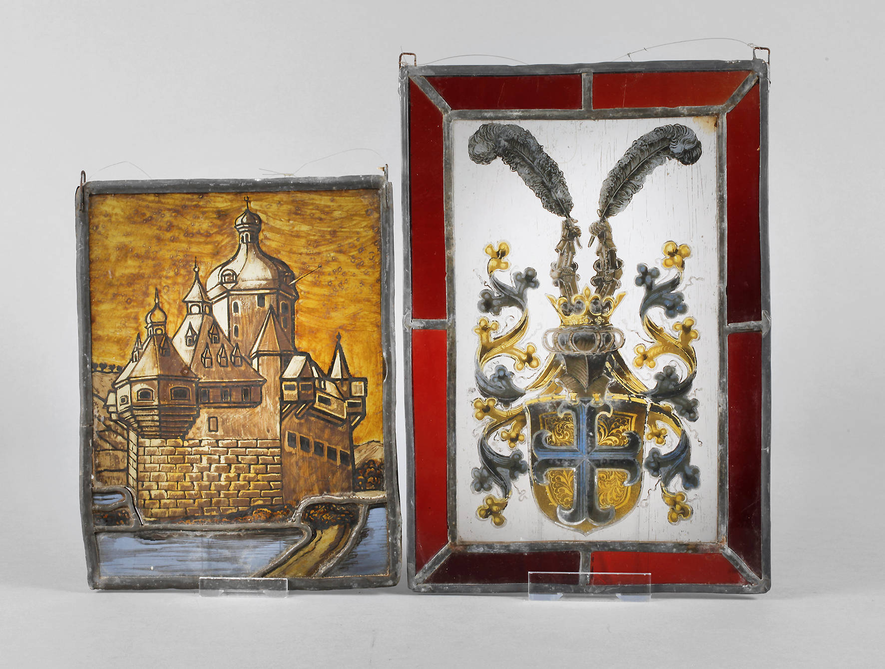 deutsch, um 1890, blasiges Klarglas in polychromer Bemalung, Wappendarstellung und Burganlage, Altersspuren, L 33 und 25 cm.