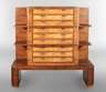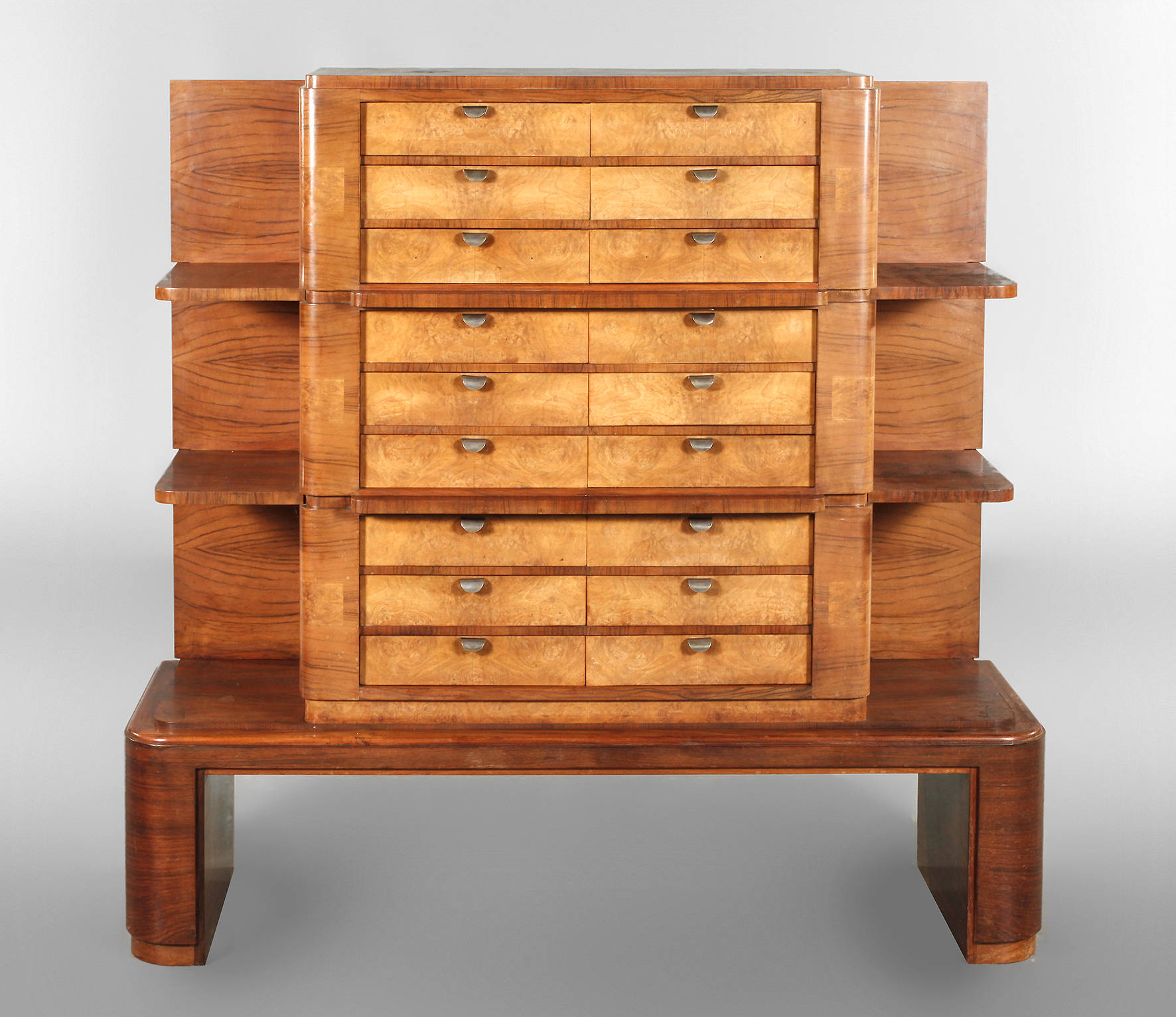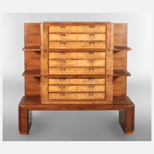 passend zu Position 2550, außergewöhnliches Kleinmöbel mit 18 Schubläden, seitlich je drei Konsolen, Alters- und Gebrauchsspuren, Oberfläche rest.bed., eine Furnierfehlstelle, H 140 x B 142 x T 42 cm.