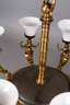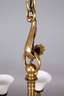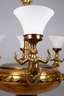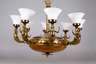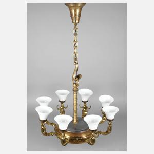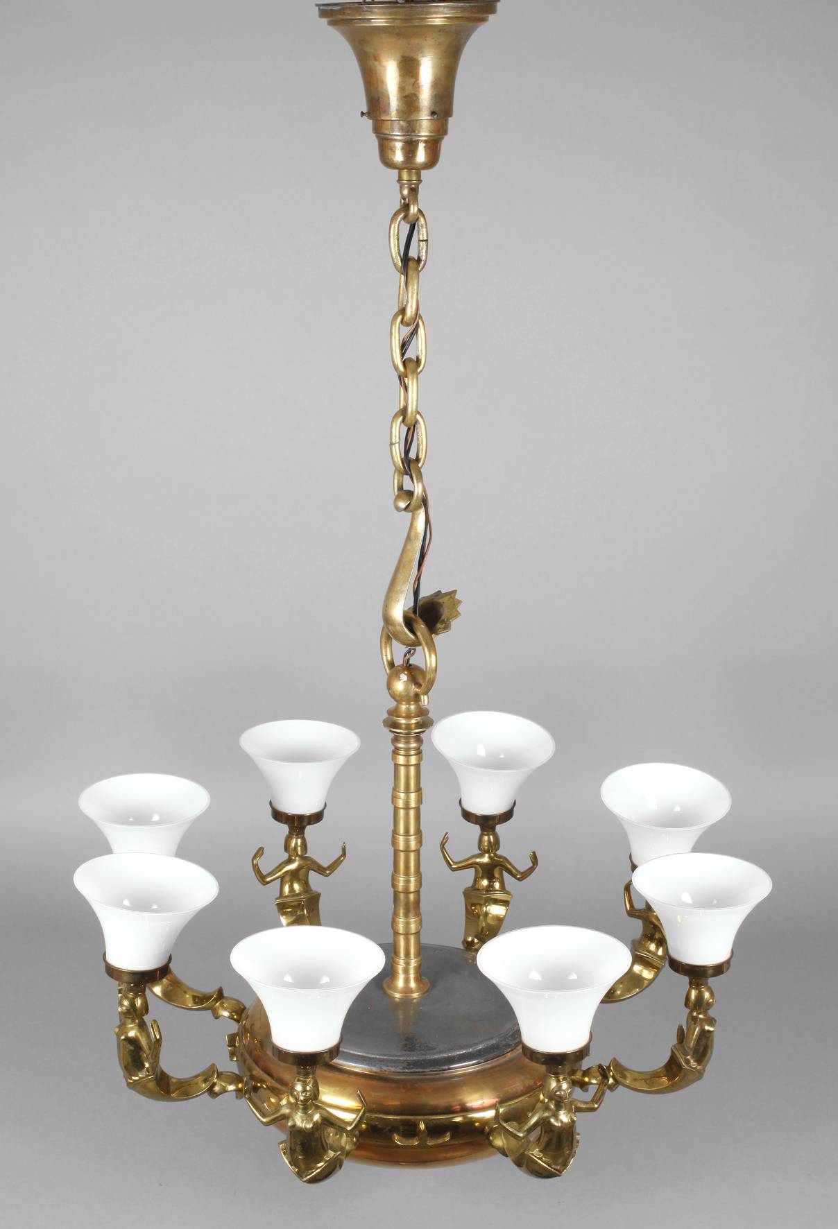 um 1920, ungemarkt, Messing getrieben und massiv, mehrteilig gegossen und verschraubt, an schwerer Gliederkette gehängter Korpus mit acht figürlich gearbeiteten Leuchterarmen in Form leicht stilisierter Nereiden, mit erhobenen Armen, jeweils eine Lampenfassung tragend, mit eingesteckten glockenförmigen Schirmen aus Milchglas, sehr gute Erhaltung, H 120 cm, D 80 cm.