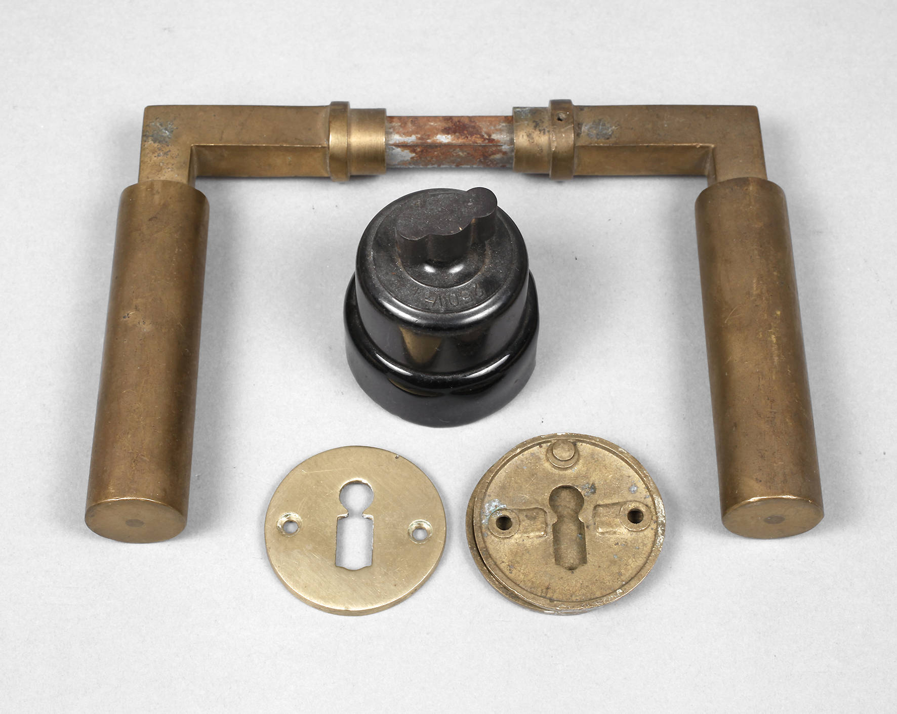 Entwurf 1922, Walter Gropius und Adolf Meyer, Ausführung S.A. Loevy Berlin, Messing, kantig umbrochene Vierkantklinken mit zylindrischem Griffabschluss, L 12 cm, dazu zwei Schlüsselschilder, beigegeben Drehschalter Peter Behrens, schwarz glasiertes Porzellan und Bakelit, D 5 cm. Quelle Klinke: Die Metallwerkstatt am Bauhaus, S. 208, Abb. 168, dort Variante in Nickel.