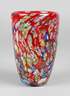 wohl Fratelli Toso um 1960 bis 1970, klares Glas, plan geschliffener Stand, roter Unterfang, flächenfüllend eingeschmolzene bunte Murrinen, Becherform, H 16 cm.