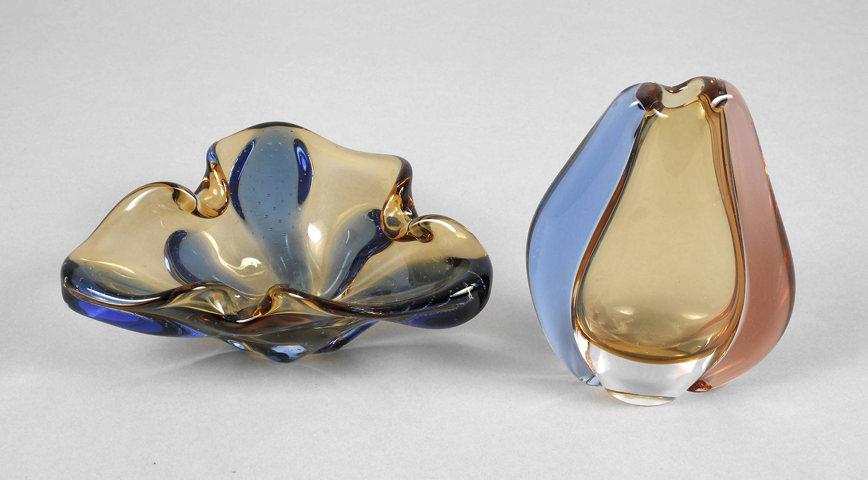 wohl Salviati, 1960er Jahre, klares Glas, honiggelb transparent unterfangen, die seitlichen Wülste der Vase in Lachs und Blau, die Aschenschale mit eingestochenem Luftblasendekor, normale Altersspuren, H und D 17 cm.