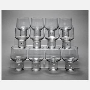 2. Hälfte 20. Jh., ungemarkt, klares Glas, ausgekugelter Abriss, massiver zylindrischer Standfuß mit eingestochener Luftblase, gebauchte, leicht konische Kuppa, drei Stück minimal bestoßen, H 12 cm.
