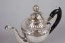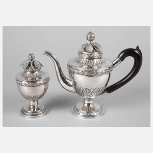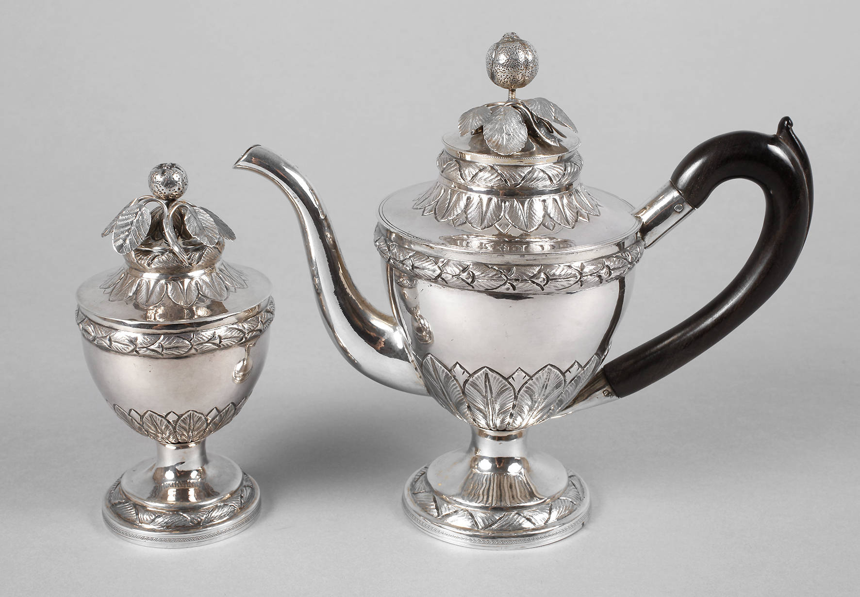 wohl Italien, 19. Jh., Kopfpunze nach links mit 8, weitere unleserl. Stempel, Silber und Ebenholz, verziert mit ziselierten Palmetten, die Deckel mit aufgeschraubten Blättern und Früchten, normale Altersspuren, H 18,5 cm und 13,5 cm, G ca. 572 g.