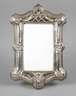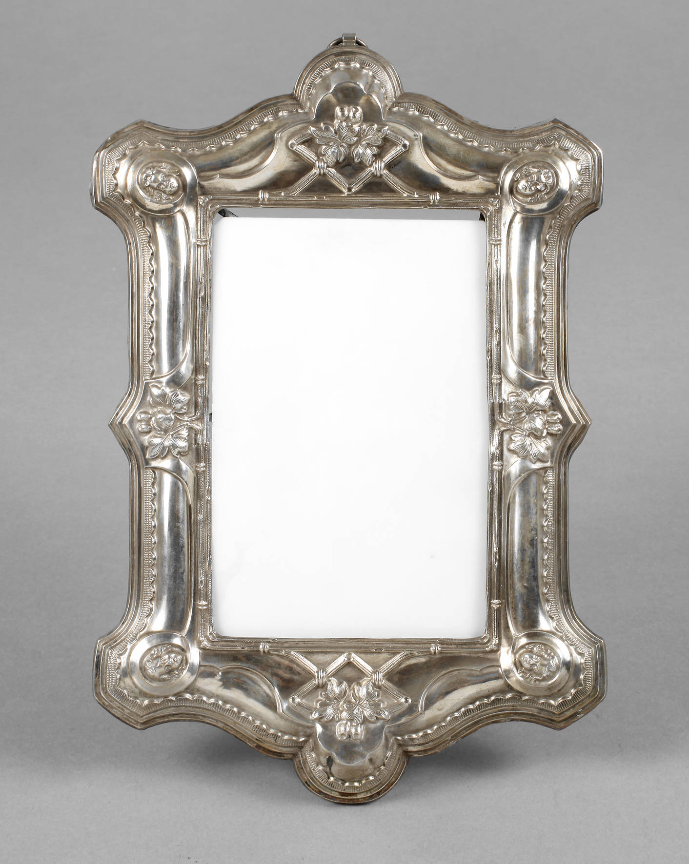 Mitte 19. Jh., Silber geprüft, aus dünnwandigem Silberblech getrieben, feine Bandmotive, Engelsgesichter und Blätter mit Früchten, Wandaufhängung, rückseitig herausnehmbare Milchglasscheibe, H 25 cm, IM 8 x 13 cm, G ca. 29 g.
