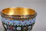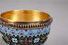um 1900, hergestellt von der berühmten Firma P. Ovchinnikov, welche gleichwertige Produkte wie die Firma Fabergé herstellte und auch bei Cartier in Paris verkaufte, signiert, Feingehaltsstempel 88 Zolotniki, Silber vergoldet, drei Tatzenfüße, auf Kugeln stehendes kugeliges Gefäß, ornamental reliefiert, mit filigranen Kordeldrähten, dazwischen buntes Opakemail, sehr gute originale Erhaltung, ohne Emailfehlstellen, H 12,5 cm. G ca. 272 g.