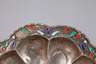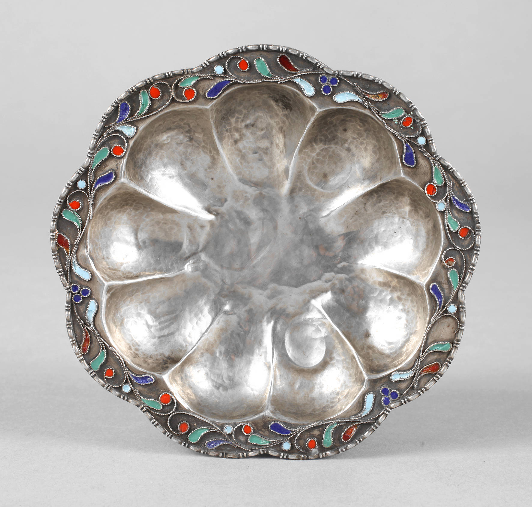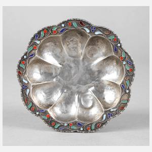 wohl Persien, 20. Jh, Silber gestempelt 925, getriebene blütenförmige Schale mit verstärktem geschweiften Rand, florale Kordeldrahtapplikation mit buntem Email, stärkere Gebrauchsspuren, D 10,5 cm, G ca. 33 g.