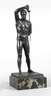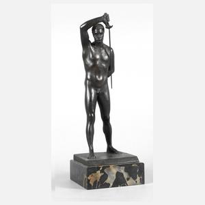 rs. bez. Hans Schuster sowie Ortsangabe Roma und dat. 1911, Bronze schwarz patiniert, stehender athletischer Männerakt, den rechten Arm über sein Haupt gelegt und den Degen haltend, die linke hinter den Rücken gelegt, auf flacher Plinthe, auf quadratischen, schön geäderten Marmorsockel montiert, Patina mit Altersspuren, H Bronze 35,5 cm, H ges. 40 cm.