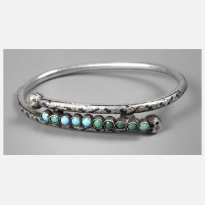 um 1900, gestempelt 84 Zolotniki, Stadtmarke St. Petersburg, Hersteller AD, Meistermarke Alexander Dalliman, tätig 1880–1905, besetzt mit 10 bläulichen und grünlichen Türkiscabochons, graviert und geschwärzt in Niellotechnik, stärkere Tragespuren, D 6,5 cm, G ca. 14,3 g.