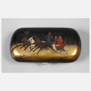 Fedoskino, 20. Jh., innen mit Firmenstempel, flachovale Dose mit scharniertem Deckel, außen schwarz und innen rot lackiert, Deckeloberseite mit typischer Darstellung einer rasanten Schlittenfahrt durch russische Winterlandschaft, min. Alterssspuren, L 10 cm.