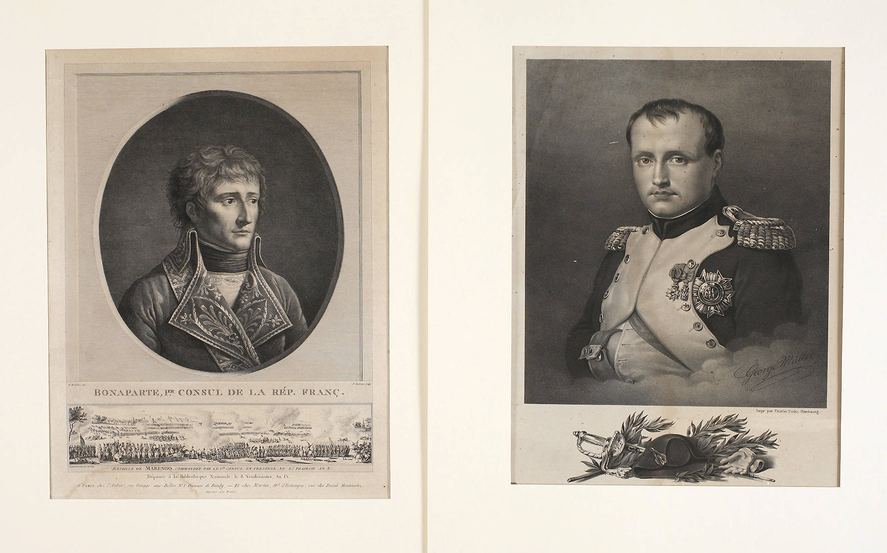 um 1800 bzw. Mitte 19. Jh., Kupferstich und Aquatinta, als erster Konsul, mit Schlachtszene von Jean Duplessi-Bertaux, Portrait von P. Audouin, dazu ein Portrait in Uniform von George Müller/Charles Fuchs Hamburg, beide im Passepartout, ungerahmt, etwas altersfleckig, 27 x 37 cm, 28 x 37 cm.