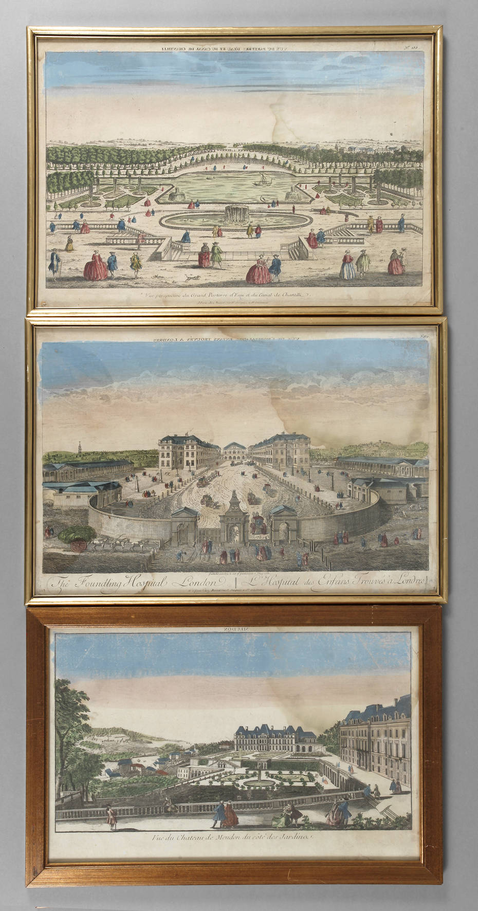 kolorierte Kupferstiche, dabei Ansicht des Londoner Foundlings Hospital, einer 1741 eröffneten Findlingsanstalt, in engl. und frz. teils spiegelverkehrt bezeichnet, dazu Blick auf den Schlossgarten von Chantilly mit dem Grand Canal, unterhalb der Abb. Druckverweis ”A Paris chez Basset rue S. Jacques a Se. Genevieve”, sowie Ansicht von Schloss und dazugehörigem Garten in Meudon, ebenfalls frz. bezeichnet, Erhaltungsmängel, alle hinter Glas gerahmt, IM 26 x 39,5 cm bzw. 23 x 30 cm.