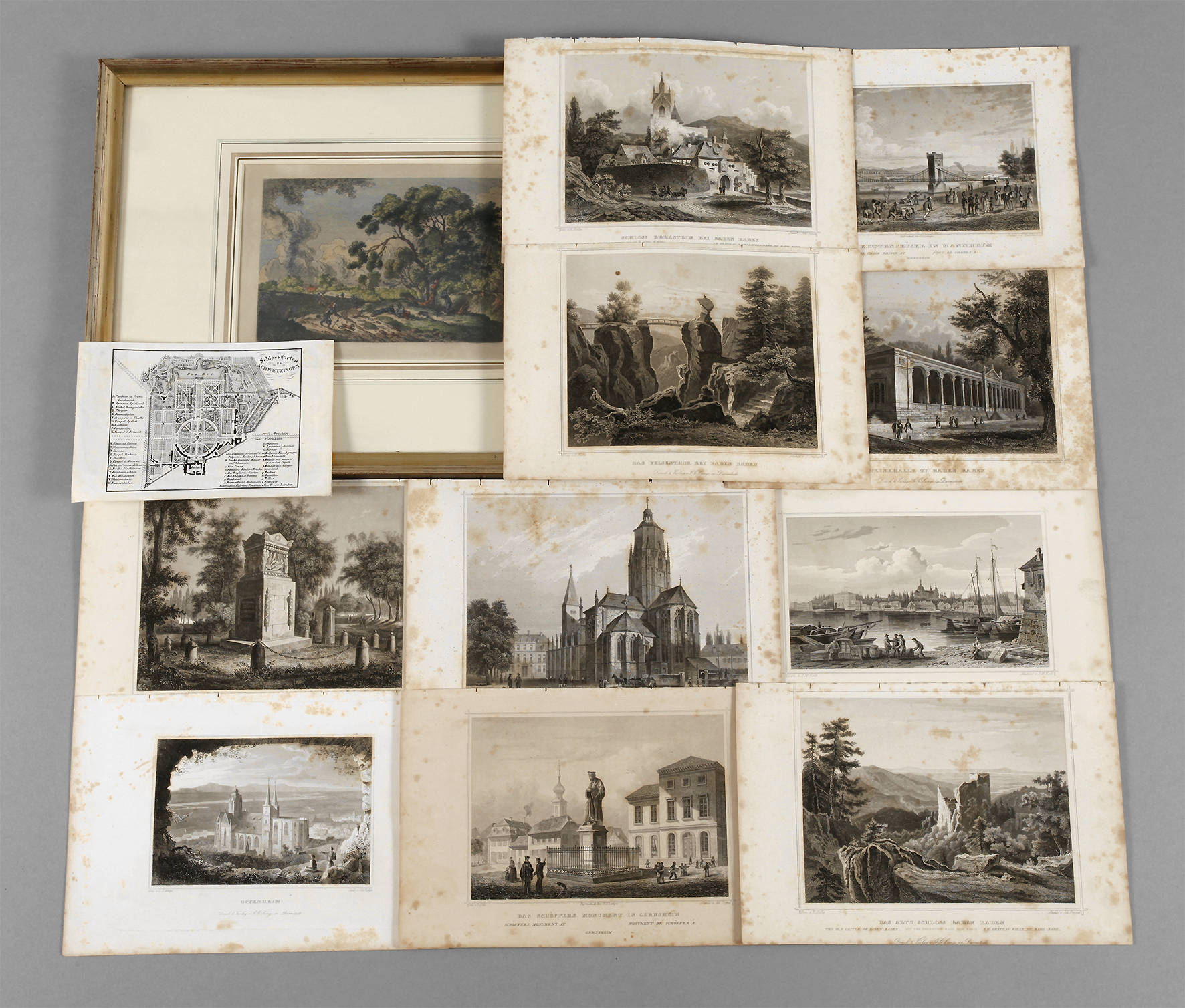 19. Jahrhundert, vorwiegend Stahlstiche, dabei Baden-Baden, Mannheim, Oppenheim, Schwetzingen, Straßburg Weißenburg, und Gernsheim, alle fleckig, einer gerahmt, dieser max. 28 x 37 cm.